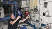 ESA astronaut André Kuipers, Expedition 30 flight engineer, works with the Synchronized Position Hold, Engage, Reorient, Experimental Satellites Zero Robotics experiment in the Kibo laboratory on the International Space Station.