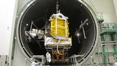 Alphasat inside the Intespace Simmer vacuum chamber. The team completes final preparations before the start of the test.