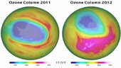 Ozone distribution over the South Pole from July to December during the years 2011 (left) and 2012 (right).