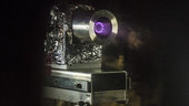 The faint purple glow comes from one of ESA’s very smallest space thrusters, being tested in a vacuum chamber in the Agency’s propulsion laboratory.