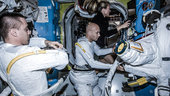 Chris Cassidy (left) and Luca Parmitano checking their spacesuits on 3 July 2013. During their sortie on 9 July, Chris will be identified by the red stripe on his suit, while Luca’s suit will be plain white.