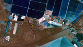 In this image, we can see division of the salt evaporation ponds. While the false colour makes them appear blue, salt ponds naturally range in colour depending on their algal concentration and salinity.