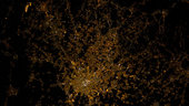 Street-lighting and well-lit buildings stand out from the darkness of agricultural fields and show the urban sprawl of this North-Italian city.