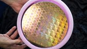 This 20 cm-diameter wafer contains 35 replicas of five different space chips, each one incorporating up to about 10 million transistors or basic circuit switches.
