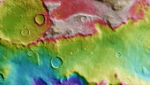 This is a colour-coded topography map of a portion of the western rim of the Hellas basin. The crater shown in the upper left is on the periphery of this larger impact basin. The edge of the Hellas basin is traced by a string of rocky peaks known as the Hellespontus Montes – revealed as the red/white ridge in this topography map thanks to their height. White and red show the highest terrains, while blue and purple show the deepest.