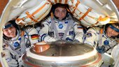 From left: ESA astronaut Alexander Gerst, Roscosmos cosmonaut Max Suraev and NASA astronaut Reid Wiseman in their Soyuz spacecraft that will fly them back to Earth after almost six months on the International Space Station.