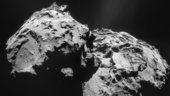 This four-image mosaic comprises Rosetta navigation camera images taken from a distance of 27.9 km from the centre of Comet 67P/Churyumov-Gerasimenko on 12 January. The image resolution is 2.4 m/pixel and the individual 1024 x 1024 frames measure about 2.4 km across. The mosaic measures 4.4 x 3.9 km.
