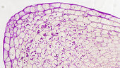 The purple dots are starch-filled statoliths that usually drop towards gravity, but this plant grew in space and the statoliths are floating in the middle of their cells.