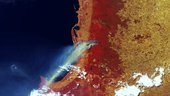 This 300 m-resolution false-colour image, acquired on 7 January, shows smoke extending over Geographe Bay into the Indian Ocean. The smoke can be differentiated from the clouds also seen in the image by its blue–grey tint.