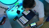 The main part of the equipment is the smartphone and camera on a 3D-printed wrist-band. mobiPV can display the procedure on a separate tablet to see more information. Here Matthias has connected a third device for testing – all three screens are synchronised.