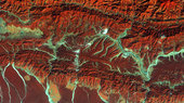 Vegetation appears red in this false-colour image, while waterways and buildings appear light green and blue.