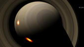 As clouds broke out in Saturn’s stormy troposphere (true cloud pattern not represented here), waves of heat travelled hundreds of kilometres upwards, depositing their energy as two vast ‘beacons’ of hot air in the stratosphere. Both hotspots travelled in a westerly direction around the planet, but the larger of the two travelled much faster, lapping the smaller one before they merged to create an enormous vortex that for a brief period exceeded even the size of Jupiter’s famous Great Red Spot. The giant vortex was visible only to infrared cameras, and persisted long after the clouds from the storm had faded away. The beacon laps the planet once every 120 days and is expected to have dissipated by the end of 2013.