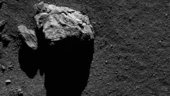 A large boulder sitting in a dusty region in the Hatmehit region on Comet 67P/Churyumov-Gerasimenko’s small lobe.