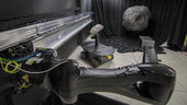 The camera seen to the right, mounted on a 33 m track, approaches this miniature binary asteroid system to test vision-based navigation software. Employing 3D printed asteroid models, this test took place in ESA’s GNC Rendezvous, Approach and Landing Simulator, or GRALS.