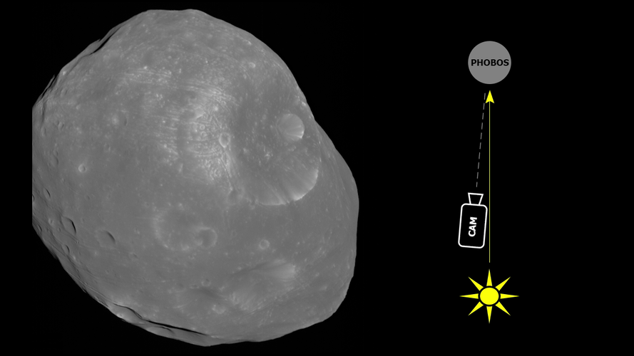 This image sequence nicely demonstrates the concept of ‘phase angle’: the angle between a light source (in this case, the Sun) and the observer (Mars Express’ HRSC), as viewed from the target object itself (Phobos). The initial phase angle is 17 degrees, drops to almost 0 degrees mid-way through (when Phobos is at its brightest), and then rises to 15 degrees by the end of the animation.