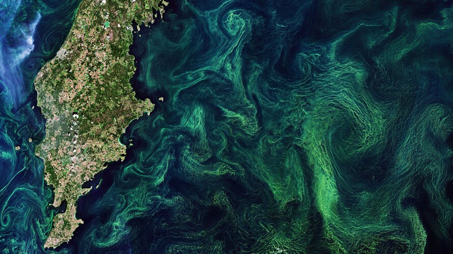 In this image captured on 20 July 2019, the streaks, eddies and whirls of the late summer blooms, mixed by winds and currents, are clearly visible. Without in situ measurements, it is difficult to distinguish the type of algae that covers the sea as many different types of algae grow in these waters.
