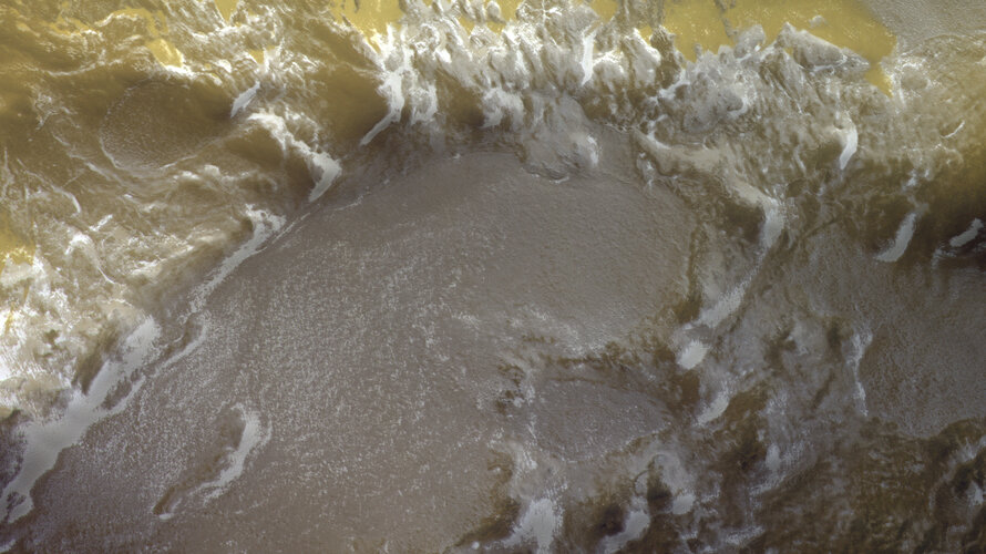 At this time, it was mid-summer in the northern hemisphere of Mars: the carbon dioxide ice cover had retreated, revealing the permanent water ice deposits much more clearly, along with details of surfaces previously covered in ice.