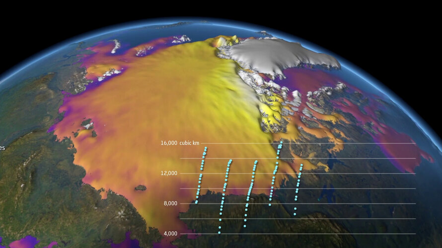 Sea-ice thickness and volume are essential climate variables that critically contribute to the characterisation of Earth’s climate. Combining data from ESA’s CryoSat satellite, which measures thick ice, and ESA’s SMOS satellite, which measures thin ice, allows for the measurement of thickness for both first-year and multi-year ice. This allows for the calculation of sea-ice volume for the whole Northern hemisphere.