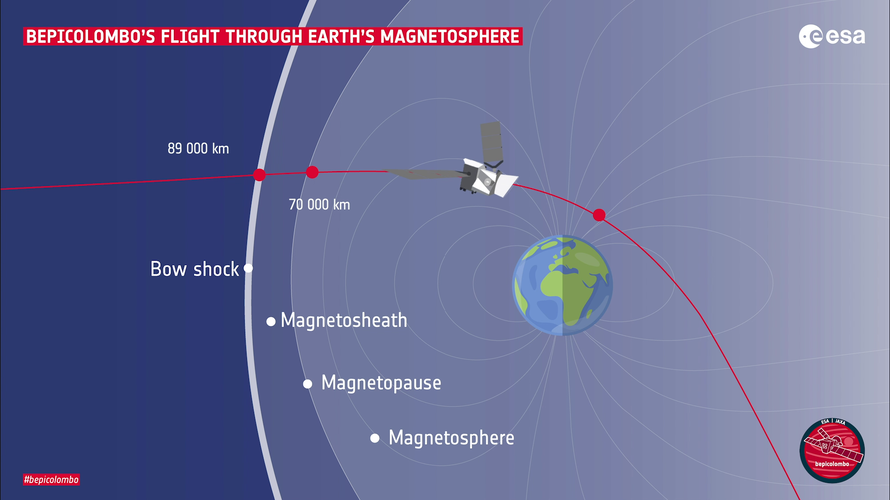The audio, accompanied by the animation, is a sonification of the captured data created by the MPO-MAG team and not an actual sound recorded in space. The audio, compressing 8 hours of recorded data into a 26-second audio track, shows the moment when BepiColombo encounters the so-called bow shock at the outer edge of the Earth’s magnetosphere where the Earth’s magnetic field interacts with the solar wind. The spacecraft then passes through the magnetosheath, a turbulent region still considerably affected by the cosmic plasma, and crosses the magnetopause, the boundary after which the magnetic field of Earth dominates.