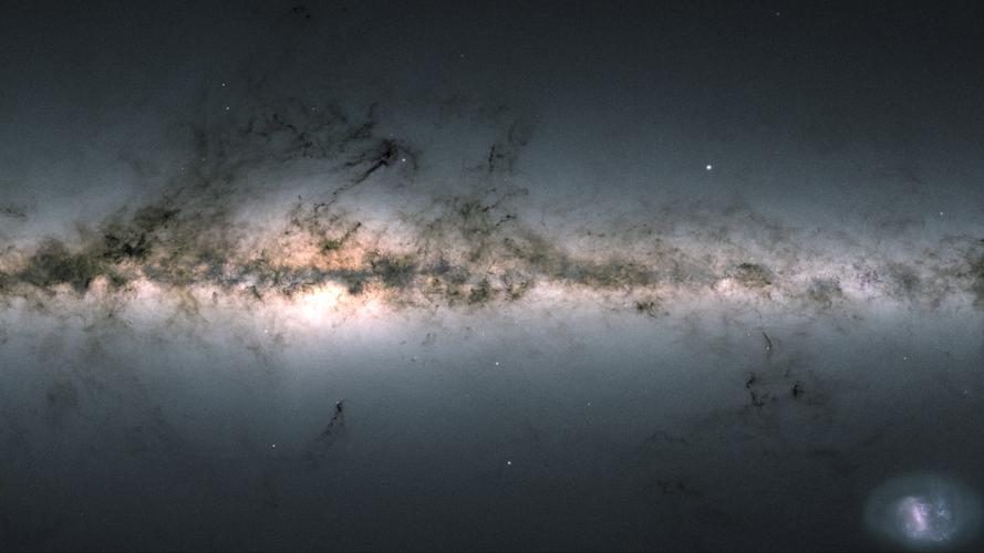 The animation ends with a pan over the Galactic plane, the bright horizontal structure that hosts most of the stars in our home Galaxy. Darker regions across the Galactic plane correspond to foreground clouds of interstellar gas and dust, which absorb the light of stars located further away, behind the clouds. Many of these conceal stellar nurseries where new generations of stars are being born.