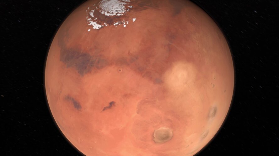 Located in the northern lowlands of the Red Planet, south of the large Olympia Undae dune field that partly surrounds Mars’ north polar cap, this well-preserved impact crater is filled with water ice all year round. The crater’s floor lies two kilometers below its rim, enclosing a 1.8 km thick domed deposit that represents a large reservoir of non-polar ice on Mars.