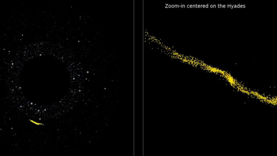 Located 153 light years away, the Hyades is between 600 and 700 million years old. During that time, stars have been ‘leaking’ out of the central cluster to form two ‘tidal tails’ that stretch across space. Gaia data has now allowed these tails to be traced across the whole sky and a mystery has been uncovered. The tails should contain roughly the same number of stars as each other but there are many more stars in the leading tail than in the trailing one. This simulation shows why that might be true. The left panel shows a schematic of the Milky Way galaxy. The Hyades star cluster is shown in yellow. The right-hand panel shows a close-up of the cluster. The grey spots show clumps of matter in the Milky Way. These could be molecular clouds, other star clusters, or clumps of dark matter termed sub-halos. As time passes, the Hyades and the other clumps orbit the centre of the galaxy. Close to the end of the simulation, one of the clumps passes through one of the Hyades tidal tails, scattering stars out of the tail.
