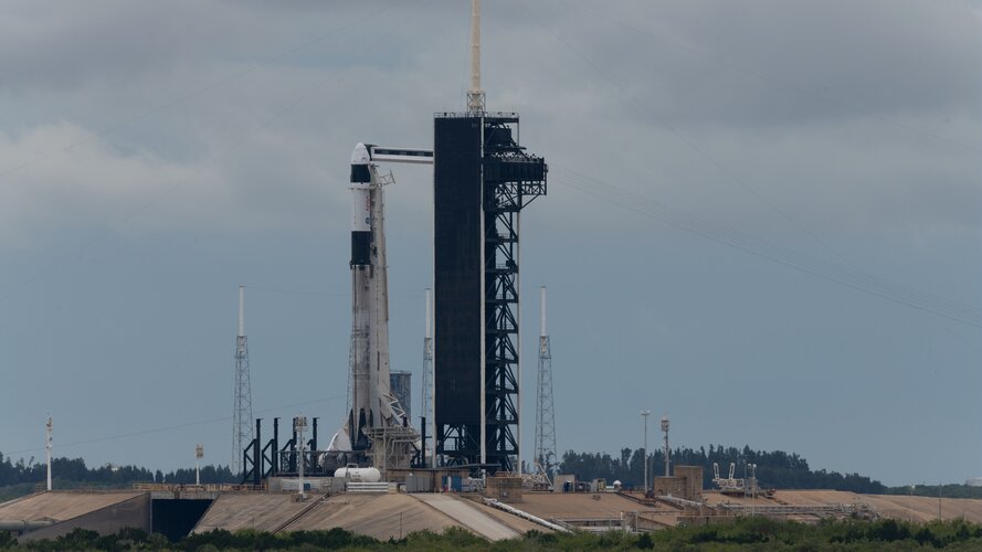 A Falcon 9 Crew Dragon is prepared for the launch of Crew-2 on launch pad 39A on 19 April 2021 at the Kennedy Space Center in Florida, USA.