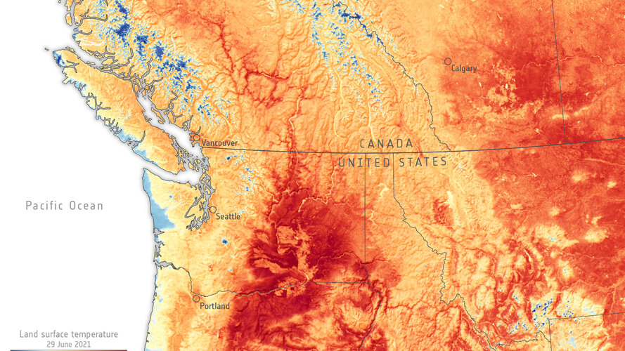 The heatwave now hitting parts of western Canada and the US has been particularly devastating. This Copernicus Sentinel-3 image shows land surface temperature.