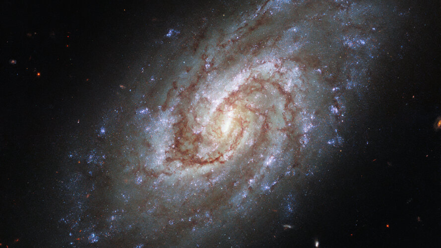 This portrait of IC 1954 was captured with Hubble’s Wide Field Camera 3, and is one of a set of observations designed to take advantage of some telescope teamwork. Hubble observed groups of young stars in nearby galaxies at ultraviolet and optical wavelengths while the Atacama Large Millimeter/submillimeter Array — a ground-based radio telescope — gathered data on star-forming discs and clouds of cold gas. Combining the two sets of observations allowed astronomers to join the dots and understand the connections between young stars and the clouds of cold gas which give rise to them.