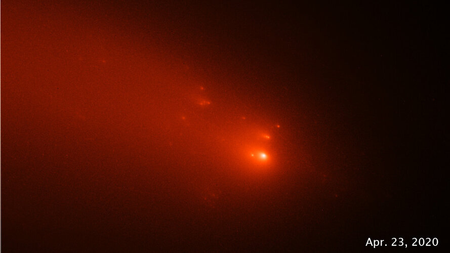 This pair of NASA/ESA Hubble Space Telescope images of comet C/2019 Y4 (ATLAS), taken on April 20 and April 23, 2020, reveal the breakup of the solid nucleus of the comet. Hubble photos identify as many as 30 separate fragments. The comet was approximately 146 million kilometres from Earth when the images were taken. The comet may be a broken off piece of a larger comet that swung by the Sun 5,000 years ago.