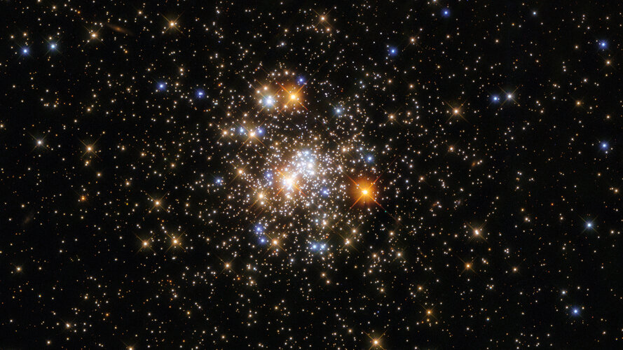 This star-studded image from the NASA/ESA Hubble Space Telescope depicts NGC 6717, which lies more than 20 000 light-years from Earth in the constellation Sagittarius. NGC 6717 is a globular cluster, a roughly spherical collection of stars tightly bound together by gravity. Globular clusters contain more stars in their centres than their outer fringes, as this image aptly demonstrates; the sparsely populated edges of NGC 6717 are in stark contrast to the sparkling collection of stars at its centre.