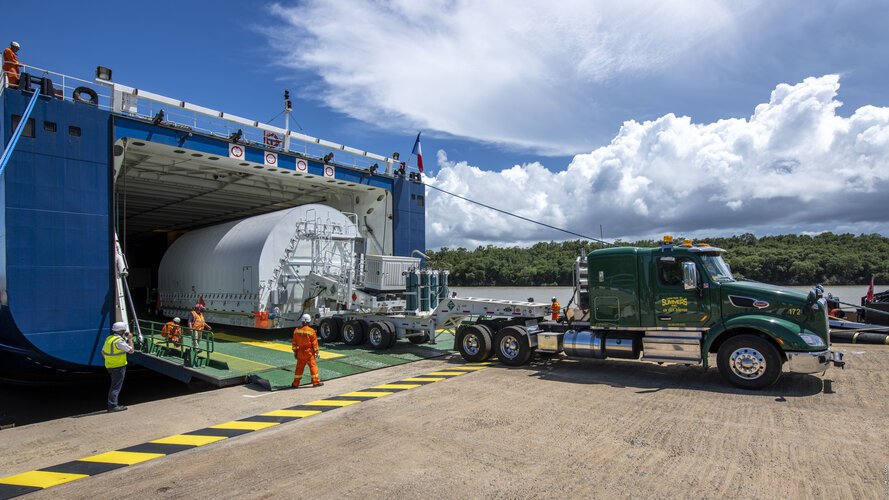 Webb arrived from California on board the MN Colibri which sailed the Panama Canal to French Guiana on a 16-day voyage. The shallow Kourou river was specially dredged to ensure a clear passage and the vessel followed high tide to safely reach port.