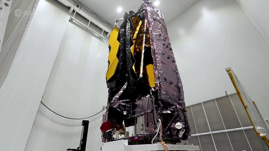 After its arrival at Pariacabo harbour in French Guiana on 12 October 2021, the James Webb Space Telescope was transported to Europe’s Spaceport and unboxed in the cleanroom. It is now being prepared for its launch on an Ariane 5 rocket in December.