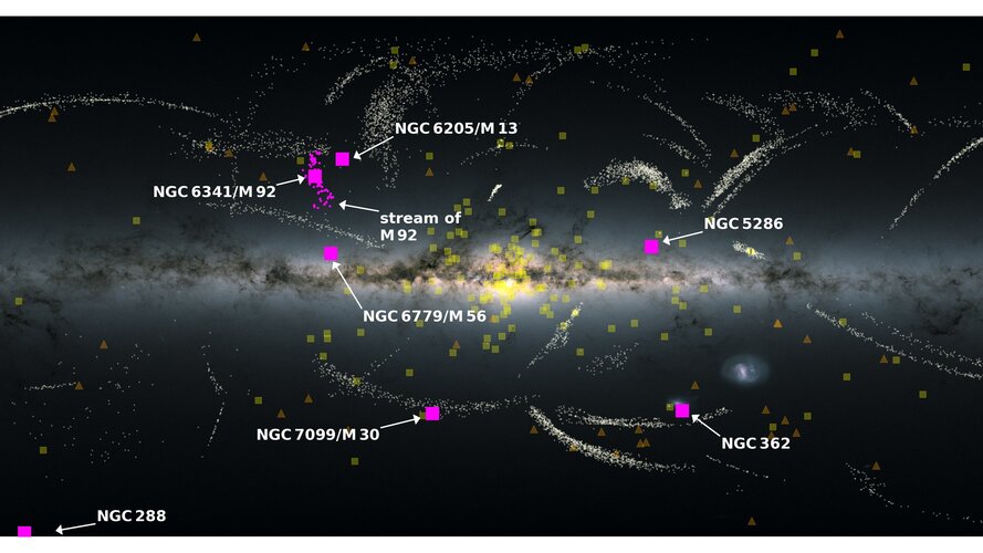 This image shows the Milky Way as seen by Gaia. The squares represent the location of globular clusters, the triangles the location of satellite galaxies, and the small dots are stellar streams. The dots and squares in purple are objects brought into the Milky Way by the Pontus merging galaxy.