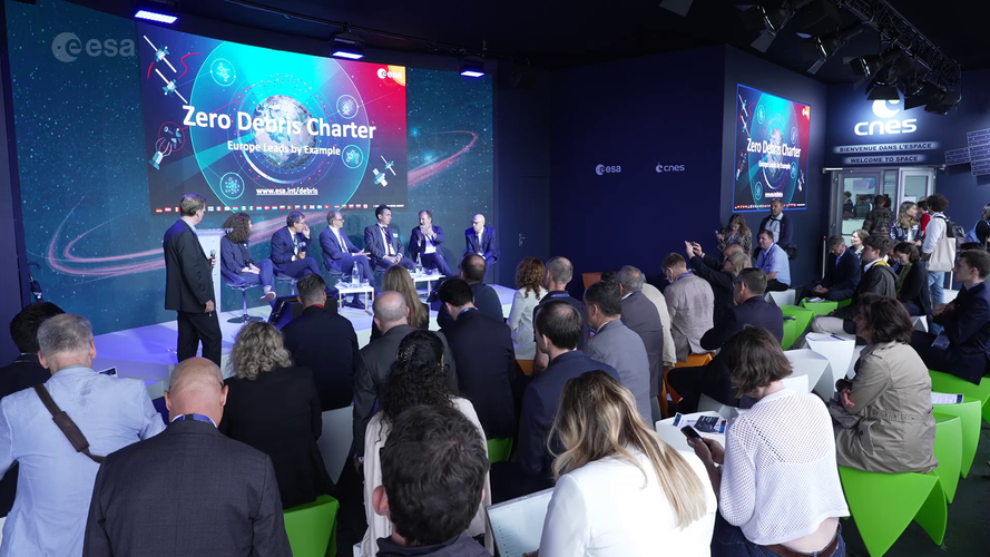 Watch the replay of the live session from Paris Air Show 2023 discussing the signature of a new European Zero Space Debris policy. ESA’s aim is to totally stop the generation of debris in valuable orbits by 2030. This approach has been initiated by the Agency in response to the catastrophic degradation of the Low-Earth Orbit environment. Speakers will include ESA representatives -including its Director General- and leading industry players.