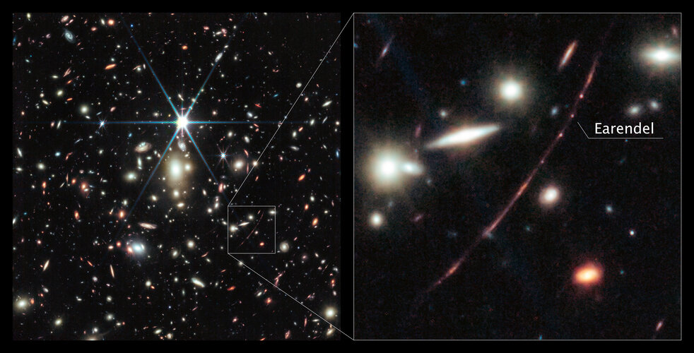 [Image description: The image is split in half vertically to create two images. In the left image, a black background is scattered with hundreds of small galaxies of different shapes, ranging in colour from white to yellow to red. Some galaxies, mostly the redder galaxies, are distorted, appearing to be stretched out or mirror imaged. Just a little bit above the centre, there is a bright source of light, a star, with 8 bright diffraction spikes extending out from it. The right image is a zoomed-in portion of the image at the left, showing a particularly long, red, thin line that stretches from 1 o’clock to 7 o’clock. There are several bright dots, some thicker than others, along this line, with one labelled as Earendel.]
