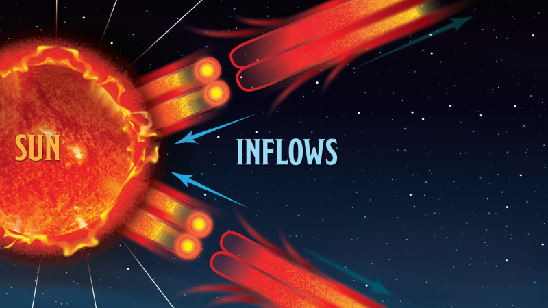 As the CME travels outward from the sun, it expands, in some cases causing nearby magnetic field lines to tear apart like the threads of an old piece of cloth pulled too tight. The torn magnetic field quickly mends itself, creating separate magnetic loops. Some of the loops travel outward from the sun, and others stitch back to it, forming inflows.